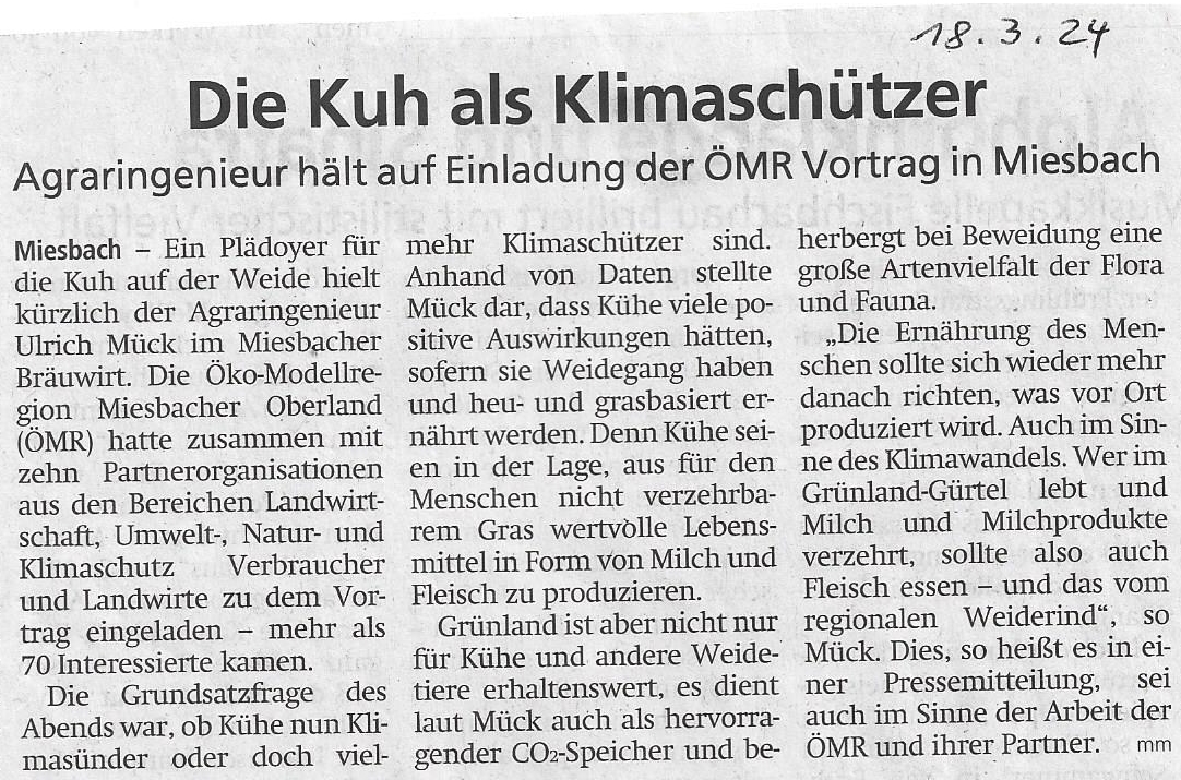 Angestoßen von der erfolgreichen Infoveranstaltung im Herbst 2023 gehen die Zivilcourage Miesbach mit der Ökomodellregion Miesbacher Oberland und weiteren Kooperationspartnern in die nächste Runde. Beim Vortrag von Öko-Agraringenieur Ulrich Mück „Grünland fürs Klima braucht nachhaltige Ernährung“ geht es um nachhaltige Öko-Landwirtschaft und Ernährung als gesellschaftliche Notwendigkeit, um den Erhalt kleiner landwirtschaftlicher Betriebe und die Bedeutung der Grünland- und Weidewirtschaft für das Klima.
